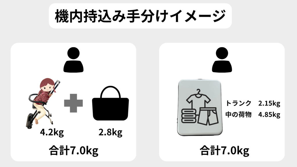 キッズトラベルNEOをトランク(2.15kg+大荷物)、ベビーカー部分(4.2kg+少しの手荷物)で手分けして持ち込むなどの工夫が必要です。