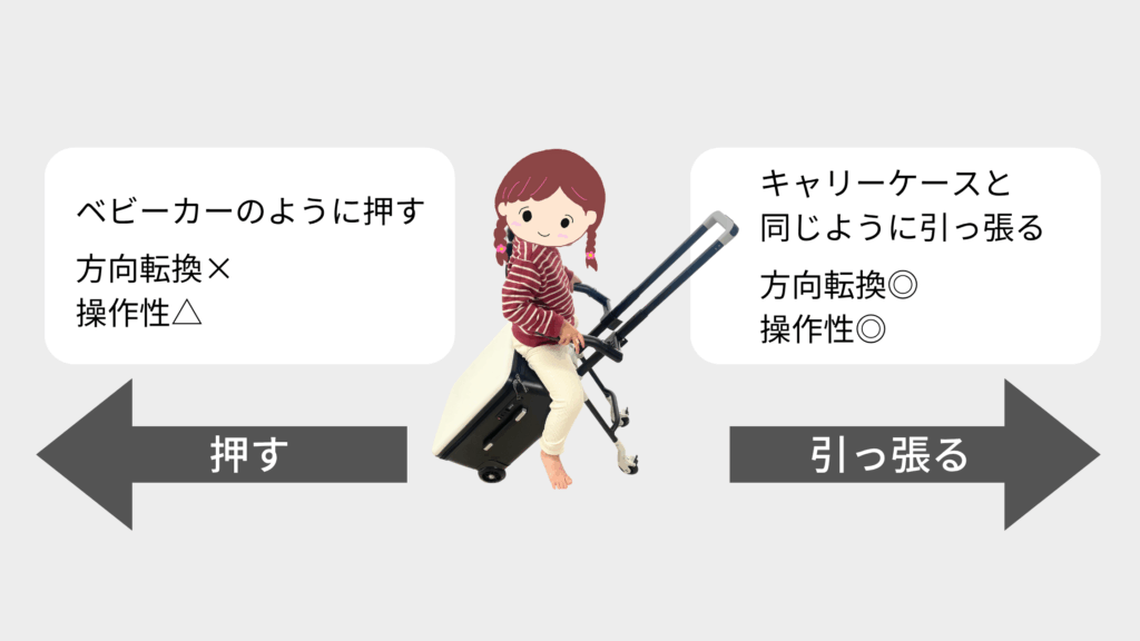 あくまでもキャリーケースを引っ張る形で作られているため、ベビーカーのように押そうとすると方向転換が難しく、押しにくいです。